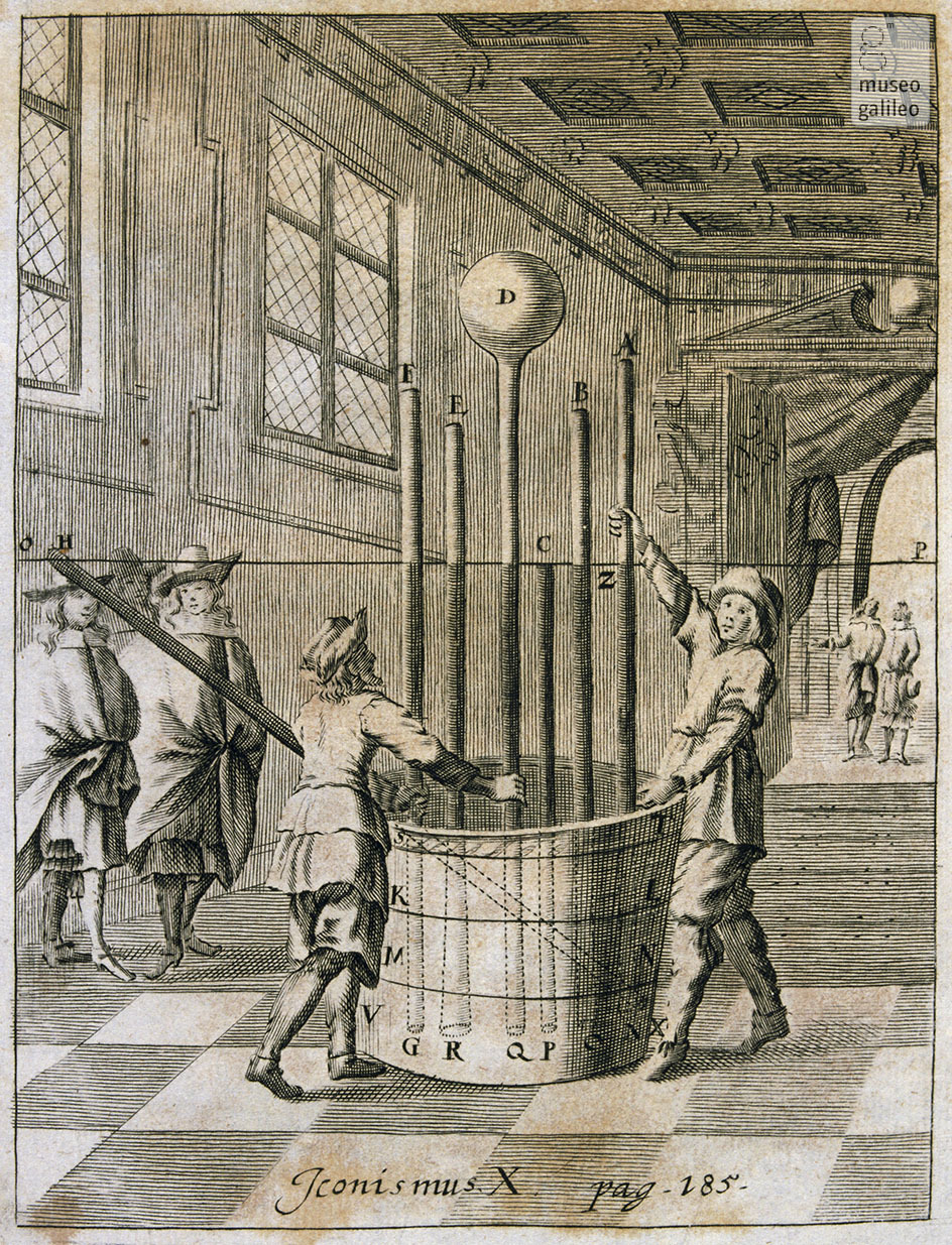 갈릴레오 갈릴레이의 제안에 따라 길이 약 4피트(1.2m)의 유리관에 수은을 가득 채운 실험을 진행했습니다. 그는 관을 접시에 담긴 수은 속에 뒤집어 놓았고, 일부 수은이 흘러나오지 않은 채 유리관 안의 상단 부분이 비어 있는 현상을 관찰했습니다. 이를 통해 그는 관 안의 빈 공간이 진공임을 알아냈습니다. 이 실험은 토리첼리를 지속적인 진공을 만든 최초의 인물로 자리매김하게 했습니다. 그는 또한 수은의 높이가 매일 변하는 것을 관찰한 후, 이 현상이 대기압의 변화 때문이라는 결론을 내렸습니다.
